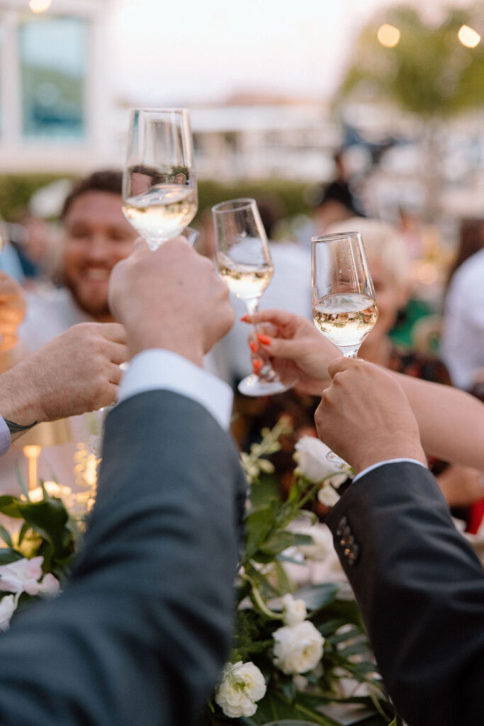 Then, in true nautical wedding fashion, Rose and Adam sailed back into the marina just as cocktail hour began. With live music in the air and friends waving from the shoreline, they made a stylish and joy-filled entrance that their guests will never forget. Meanwhile, sunset views over the water added a golden glow to the moment.